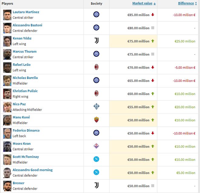 伊尔迪兹以2500万欧涨幅成为此次身价涨幅最高的意甲球员,尼科·帕斯以2000万欧位列次席。