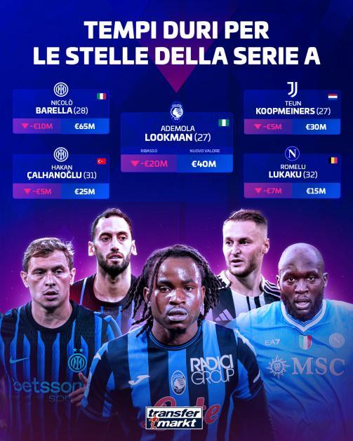 而在身价下跌方面,今夏闹转会失败的亚特兰大前锋卢克曼下跌至4000万欧,跌幅为2000万欧,成为跌幅最大的意甲球员。